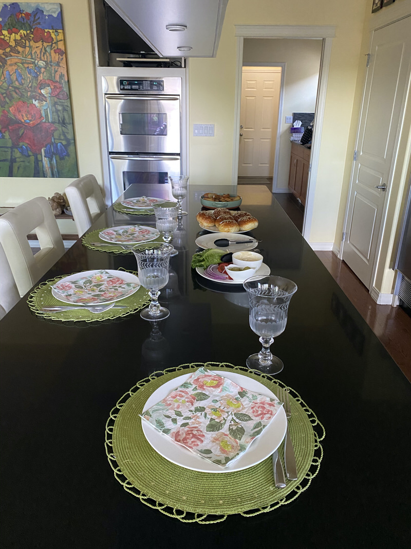 Island is where we do our casual meals and I set it up in case it was too hot, or breezy or buggy to eat outdoors, but fortunately, it was perfect, so we filled our plates here.