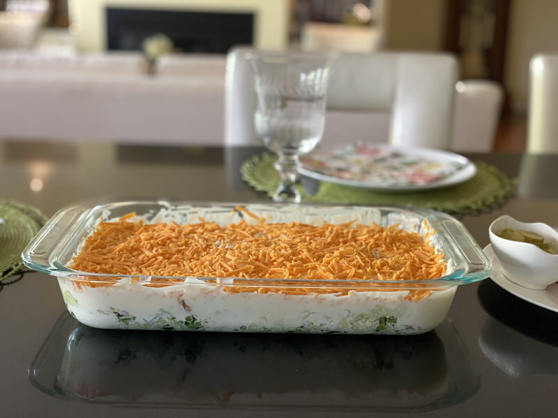 The Seven Layer Salad is a family favourite and an Alberta potluck favourite from the late ’70’s.