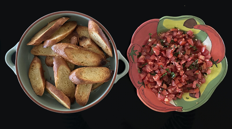 I could make a meal of these two items, above, alone. Thank you, my dear friend, Luciana, for introducing me to this so many years ago… it must be almost 35 or 40 years now. I remember the first time Luch brought a bowl of this lovely tomato basil garlic topping with her bruschetta toasts to a party for an appetizer so many years ago. None of us had a clue what to do with it. She did a 30-second demonstration and I promise you she had no leftovers to take home. We all got the recipe and made this for every party in the next few years. I make it almost every week in the summer.