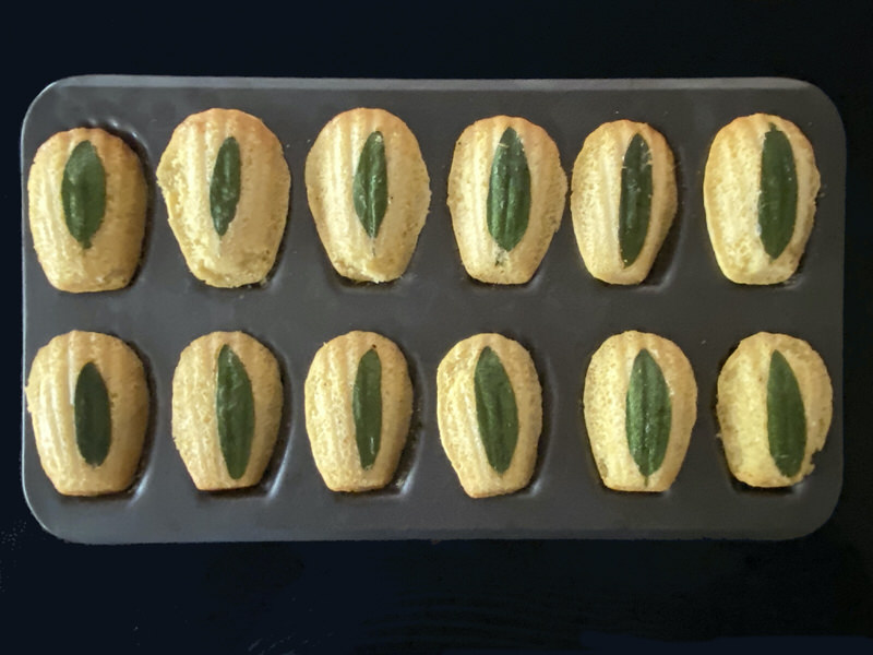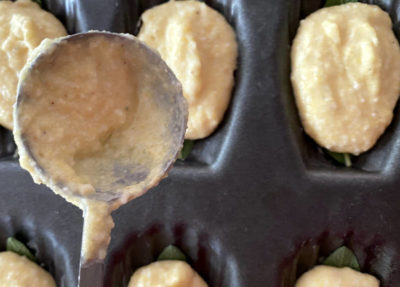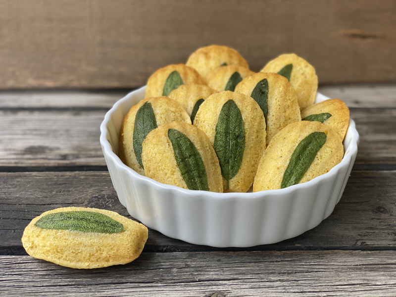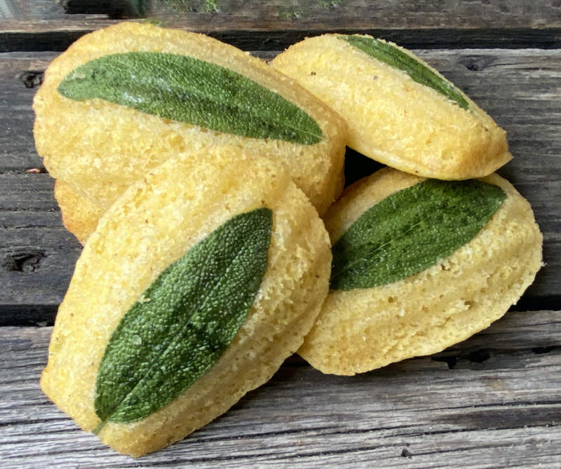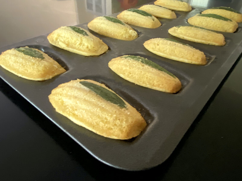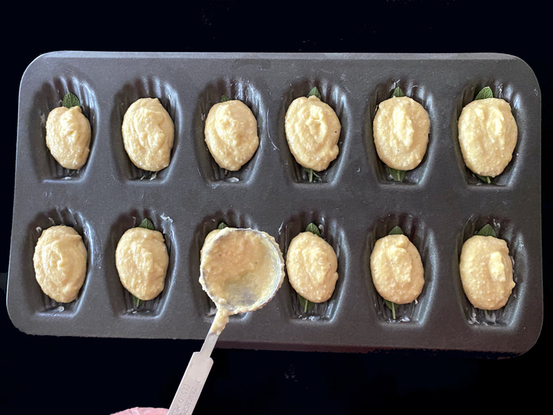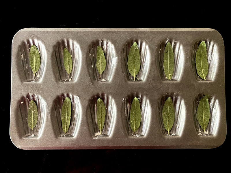 - Grease a madeleine tray and place 1 sage leaf into base of each mould and set aside