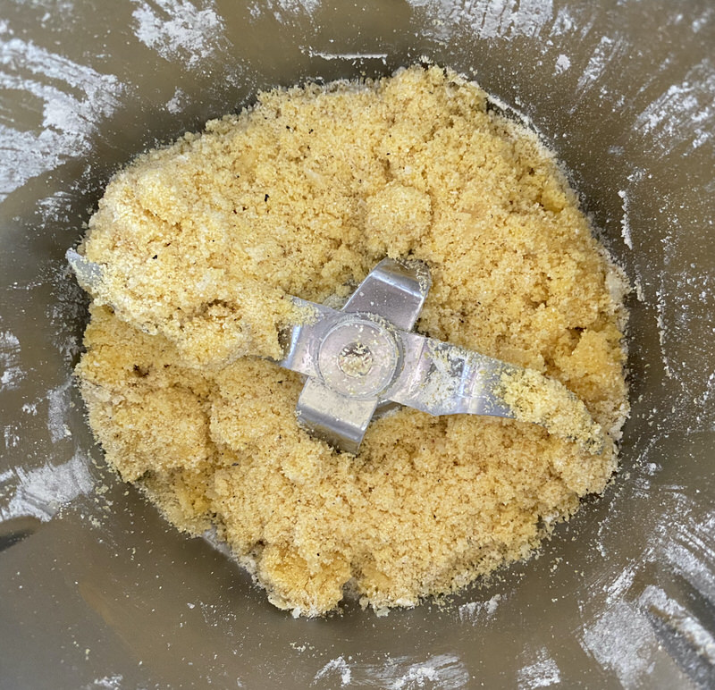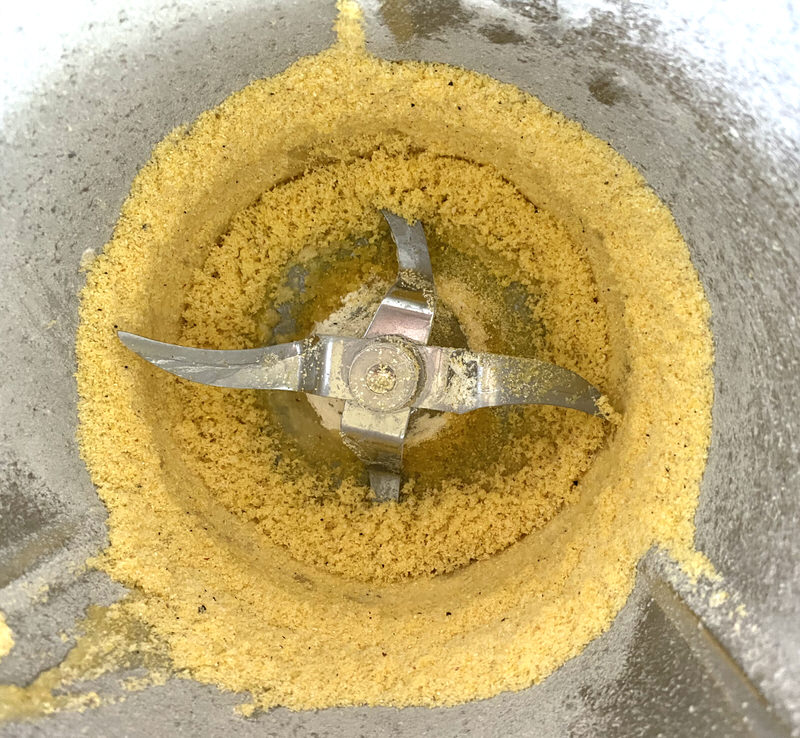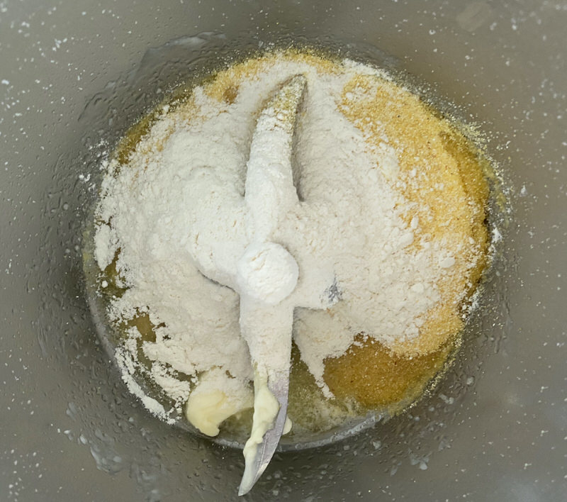 - Add polenta, flour, soda, salt and pepper and mix for 5 seconds at speed 5, scraping down sides of mixing bowl with spatula