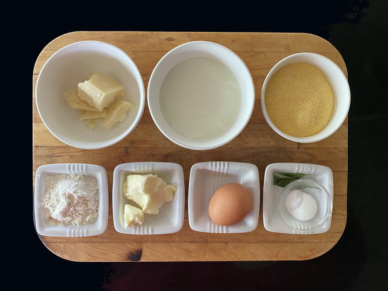 A few very simple ingredients most of us have on our home pantry: Parmesan Cheese, polenta, buttermilk, butter, flour, eggs, baking soda and salt.