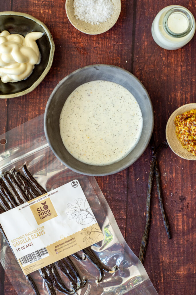 This delicious vanilla buttermilk dressing is fragrant, tangy, a little spicy from the mustard and ready in about 2 minutes. It adds a great balance to the roasted and charred brussel sprouts that have a slightly bitter but oh so good taste.