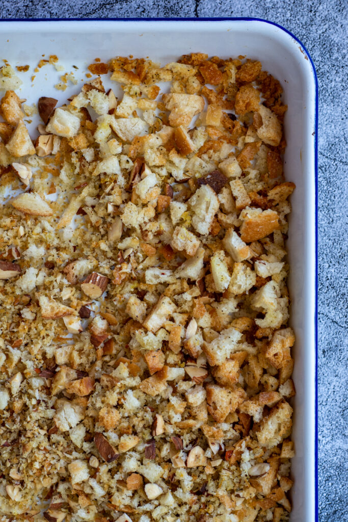 Here is the kicker when making pangrattato - add some nuts. You can thank me later. Chop up some almonds or hazelnuts and bask in the joy of delicious almond pangrattato.