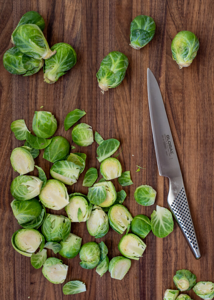 - Chop the bottom (core) off the sprouts and cut in ½