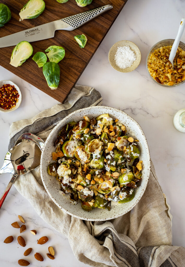 Multiple reasons to be honest. I've always been a fan of brussel sprouts. Since a young age, I was always the one to gobble up sprouts when they were on the table. Whether they were simply boiled, roasted, deep-fried or charred, I can never get enough. This particular recipe is killer because the cooking process for the brussel sprouts is quick and easy. I always have breadcrumbs in the house to sprinkle over pasta or roasted veg, and the vanilla buttermilk dressing takes about 2 minutes to make.