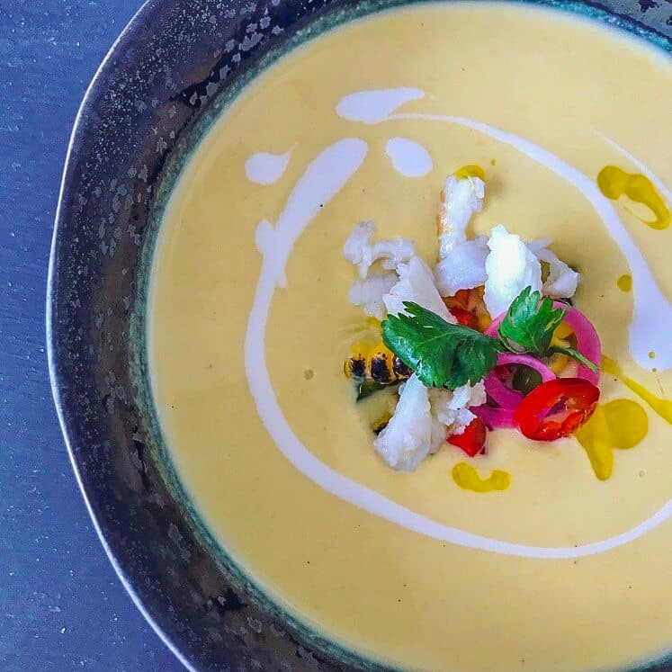 Recently I have been getting some amazing fish from our local fish shop (fresh fish co) and truthfully we don't eat enough fish at home. So when soup was requested I used it as a chance to add some fish into the diet. The addition of crab and things like charred corn, coriander & pickled onions help to take this soup from being "just soup" to something you would expect to see in a restaurant!