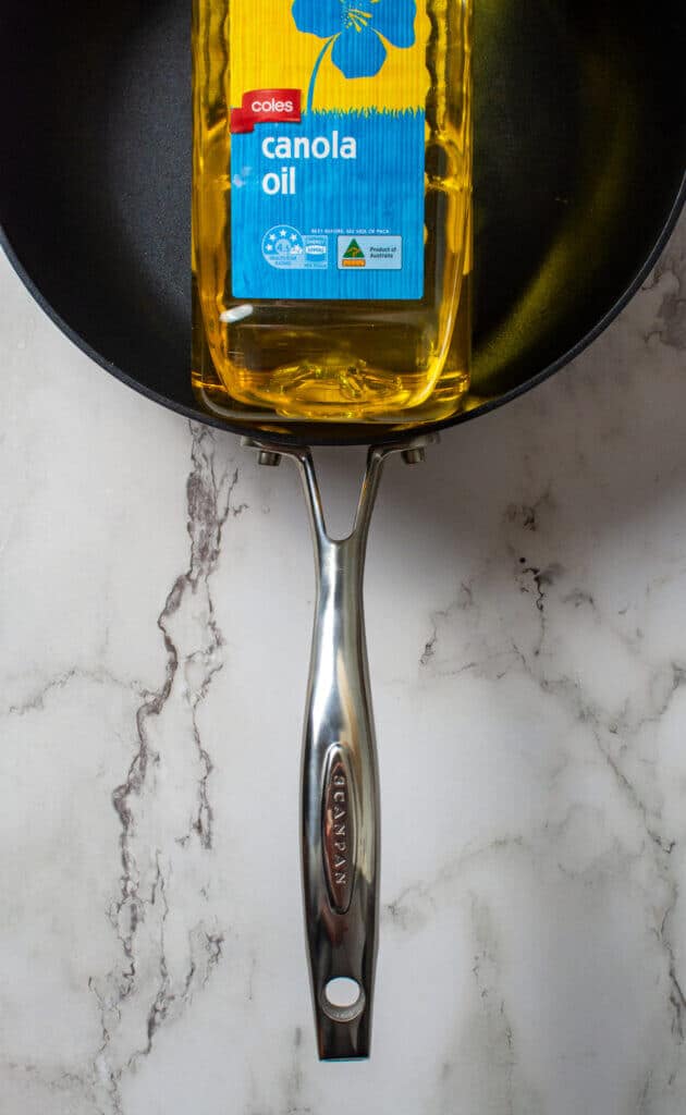 - the right amount of canola oil depends upon the pot/pan you are using. For my deep 28cm pan I used about 700ml. A narrower pan will use less and a wider pan more so it depends upon how many pieces of fish you want to fry at a time