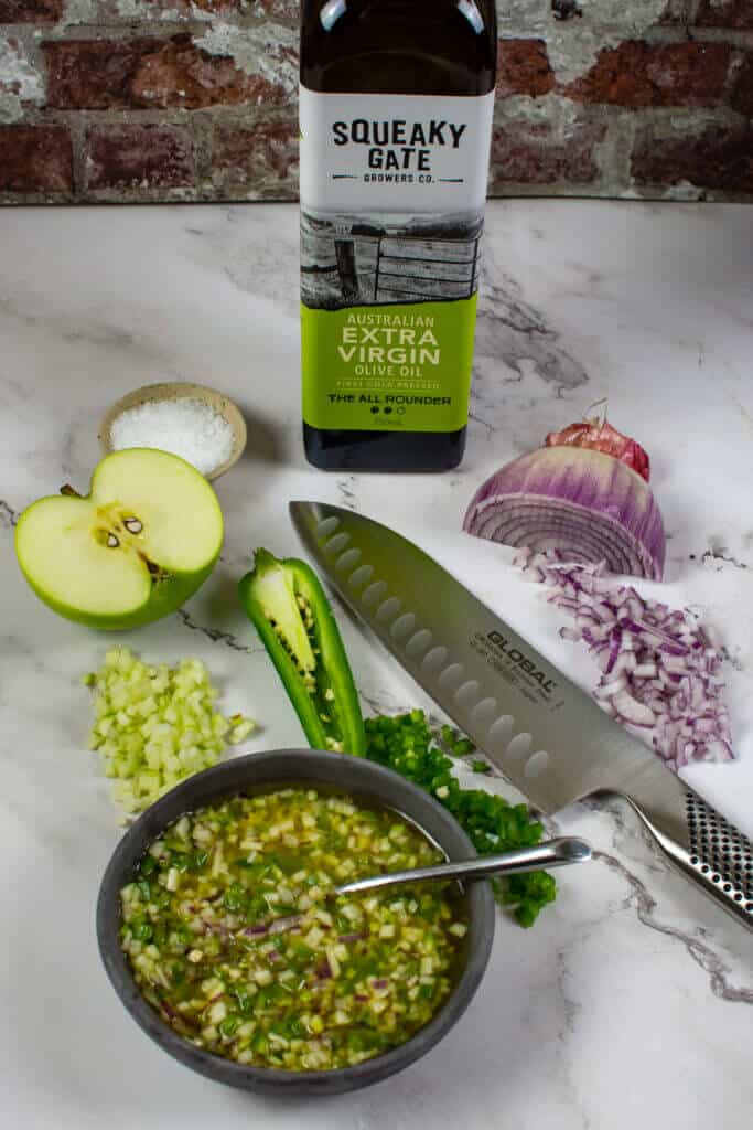 This bad boy couldn't be easier and trust me when I say it'll brighten up this not so healthy taco and make it feel a whole lot fresher. Simply cut the apple, onion, and jalapeno to similar sized pieces (I went with a fine dice), toss in some delicious Squeaky Gate Olive Oil, a pinch of salt, and lime juice. TRUST me, you will be finding other things to use this on PRETTY quickly!!