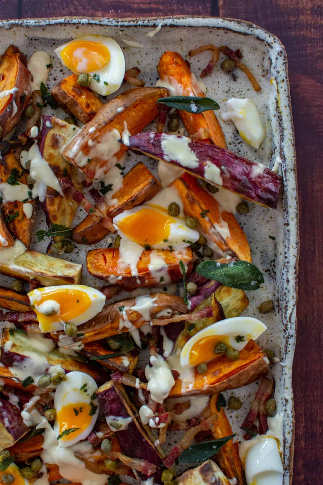 Taste. First and foremost it's tasty. Most of the food I create/cook have big bold flavours. I don't like to do things by halves and this dish punches your taste buds in many different ways. We have texture coming through from the perfectly crispy roasted sweet potatoes, protein from the egg & pancetta, creaminess from the horseradish sour cream and perfectly cooked soft boiled egg, saltiness from the capers and herbaceous notes from the crispy sage leaves. You can literally put the potatoes in the oven and get the rest prepped/cooked as they roast!
