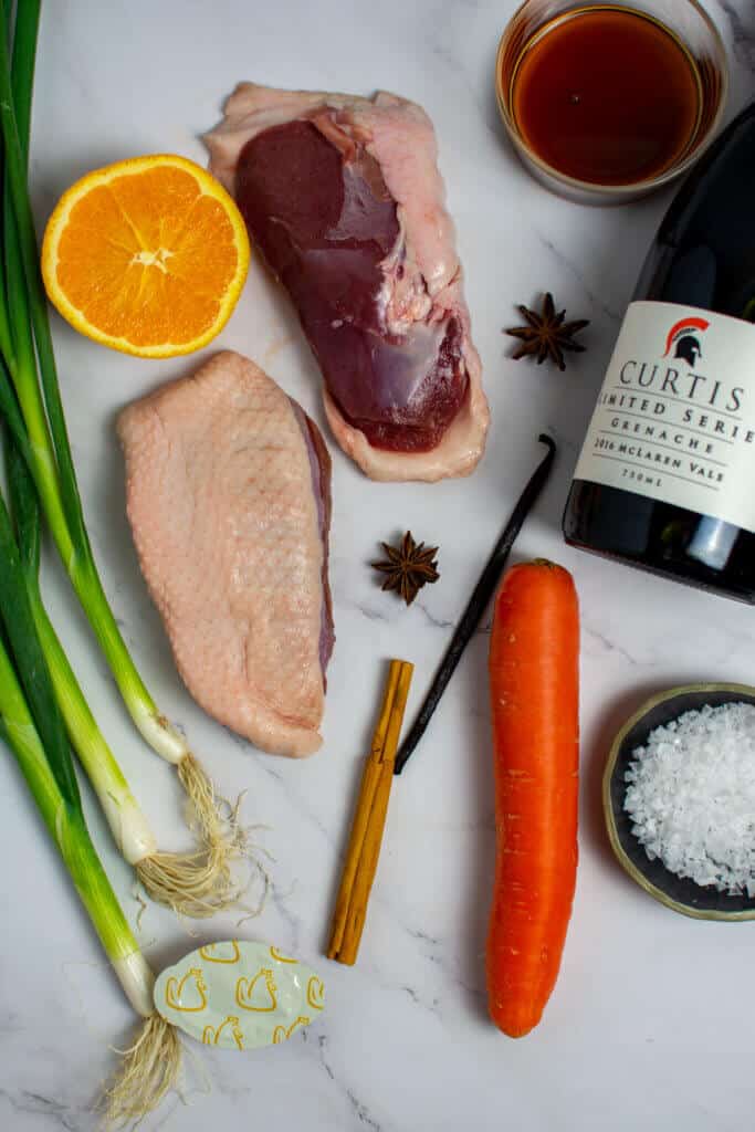 - Add all ingredients into a saucepan and simmer until reduced to 1/3 volume (approx. 10-15 minutes) – start cooking the duck