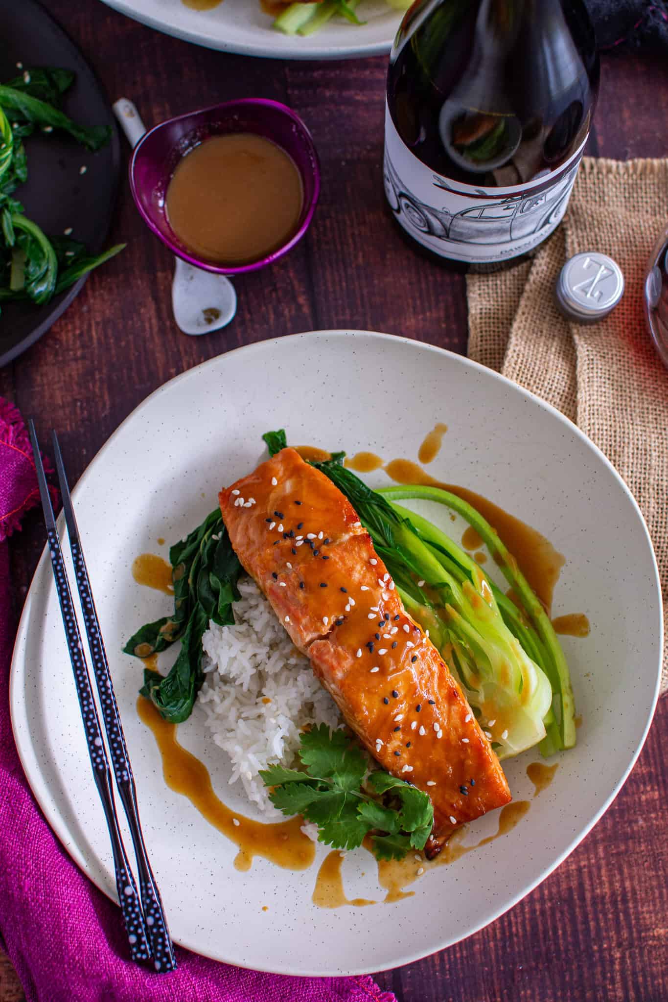- Serve dish with a spoon of rice, Asian greens and miso salmon on top – drizzle a little dressing over to finish!