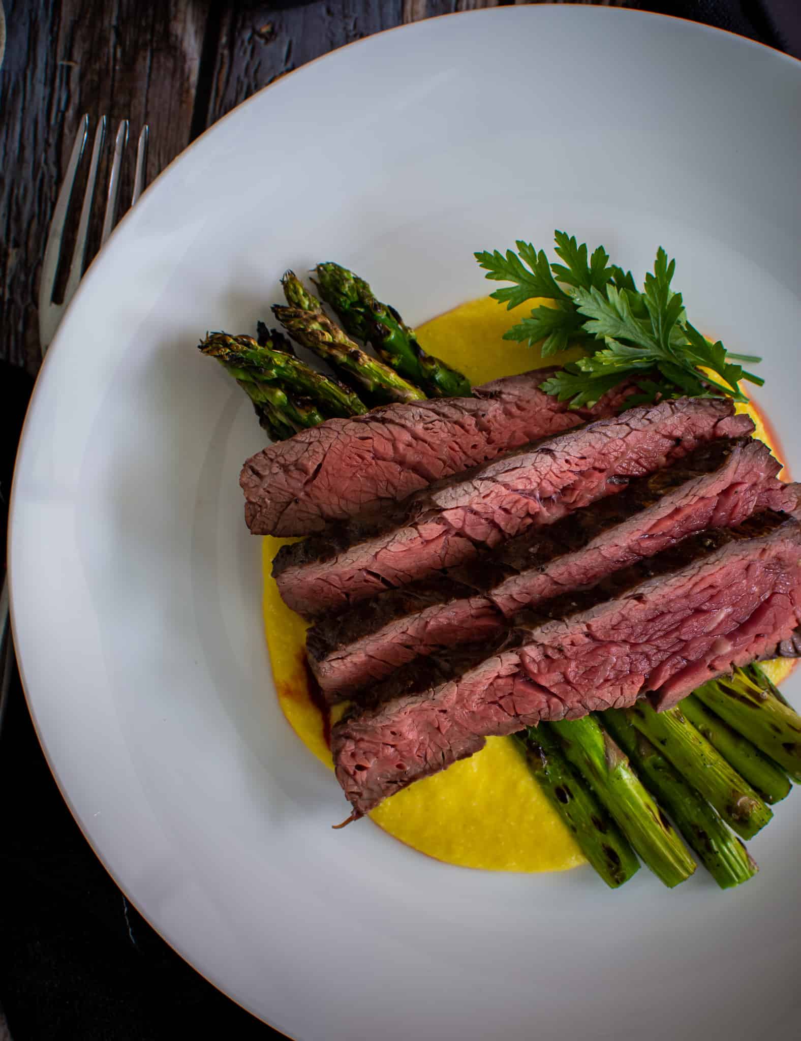 If you are looking for a perfectly cooked piece of meat that costs a fraction of the price of ribeye or sirloin with a silky sweet corn puree underneath is your bag then look no further than this grill bavette steak dish. It's got everything you want and need from a dish.