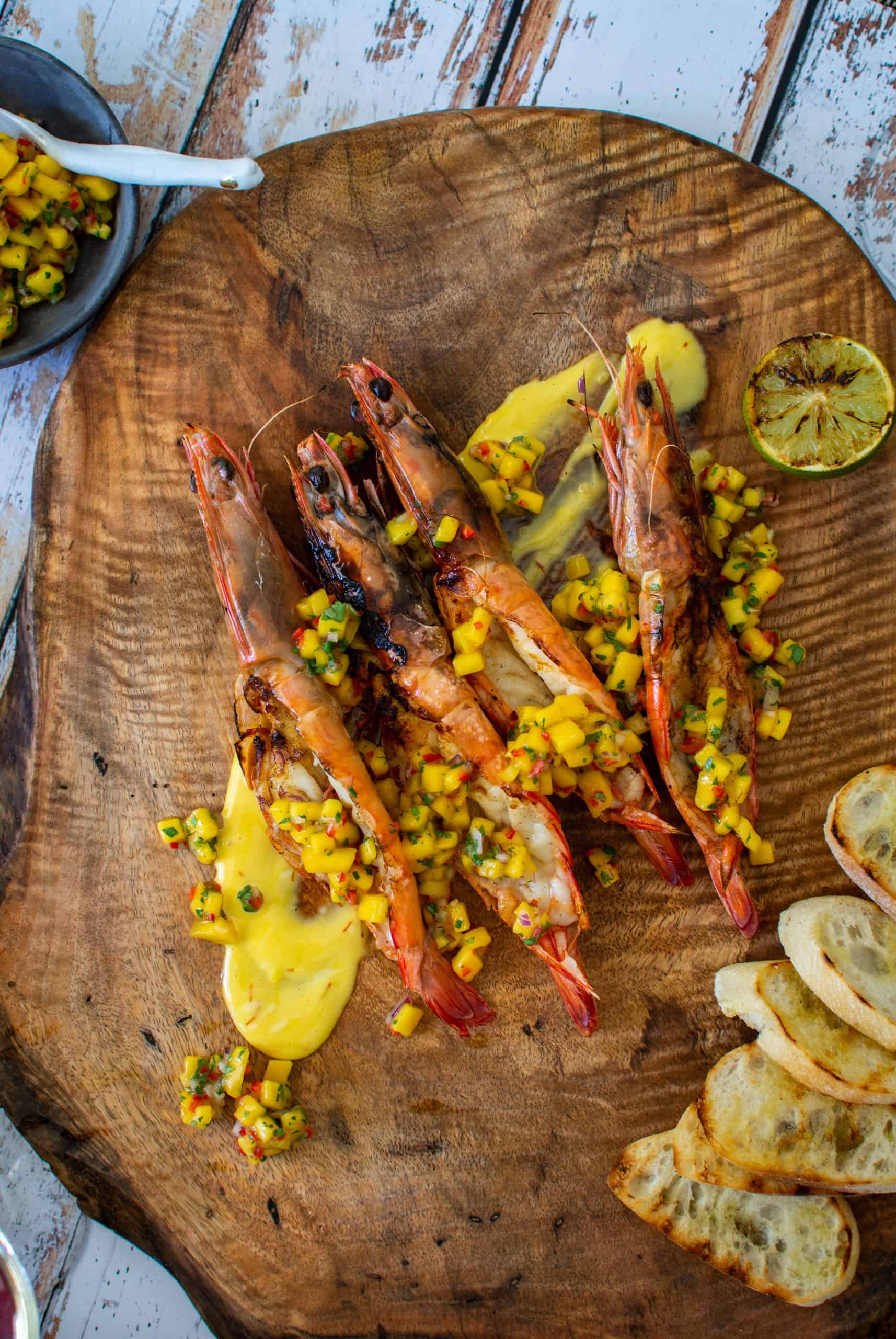 Is so delicious. Do I need to write more? It's a simple aioli made using saffron strands, egg yolks, garlic, mustard, lemon juice and a little maple syrup too. This delicious aioli pairs so well with the charred BBQ prawns and the sweetness from the mango chilli salsa.