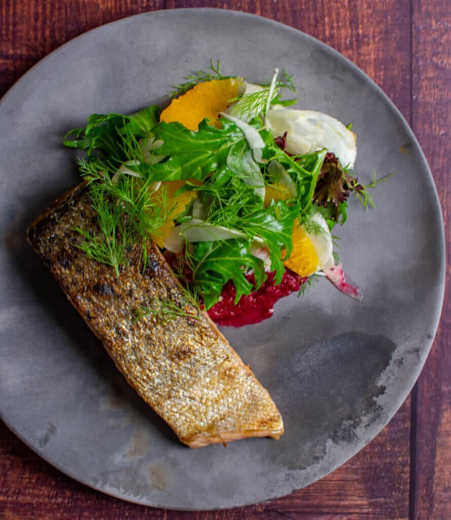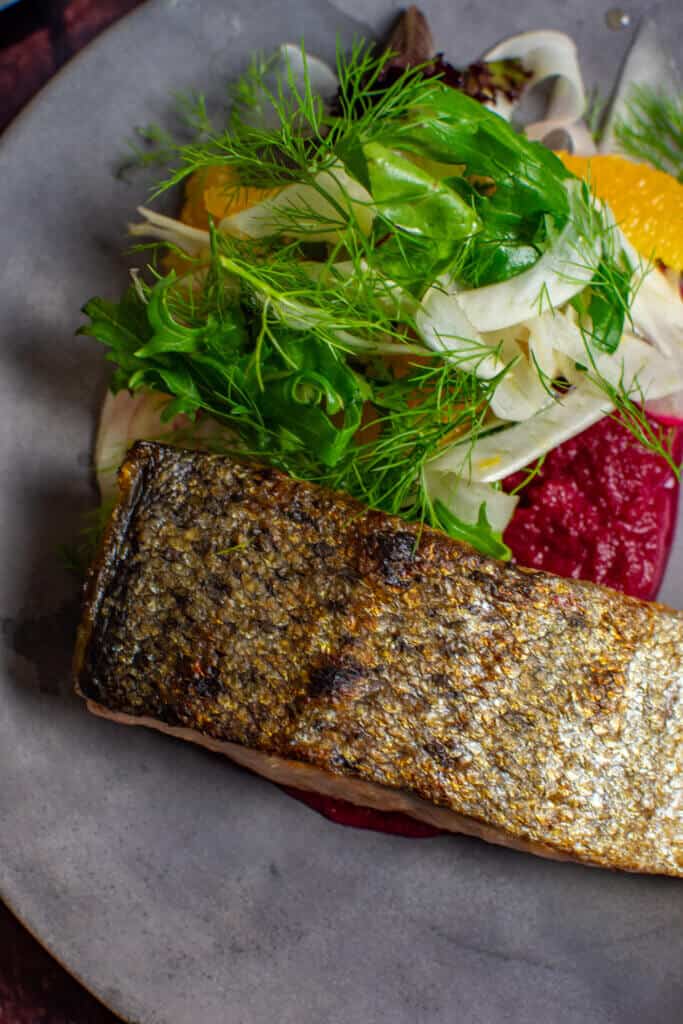 Why does this work well with the salmon? A few reasons - the acidity of the wine helps cut through the oiliness of the salmon, as mentioned there is good body to the wine to stand up to the big flavours of the dish, and finally, the earthy beetroot and fruit together are simply perfect.