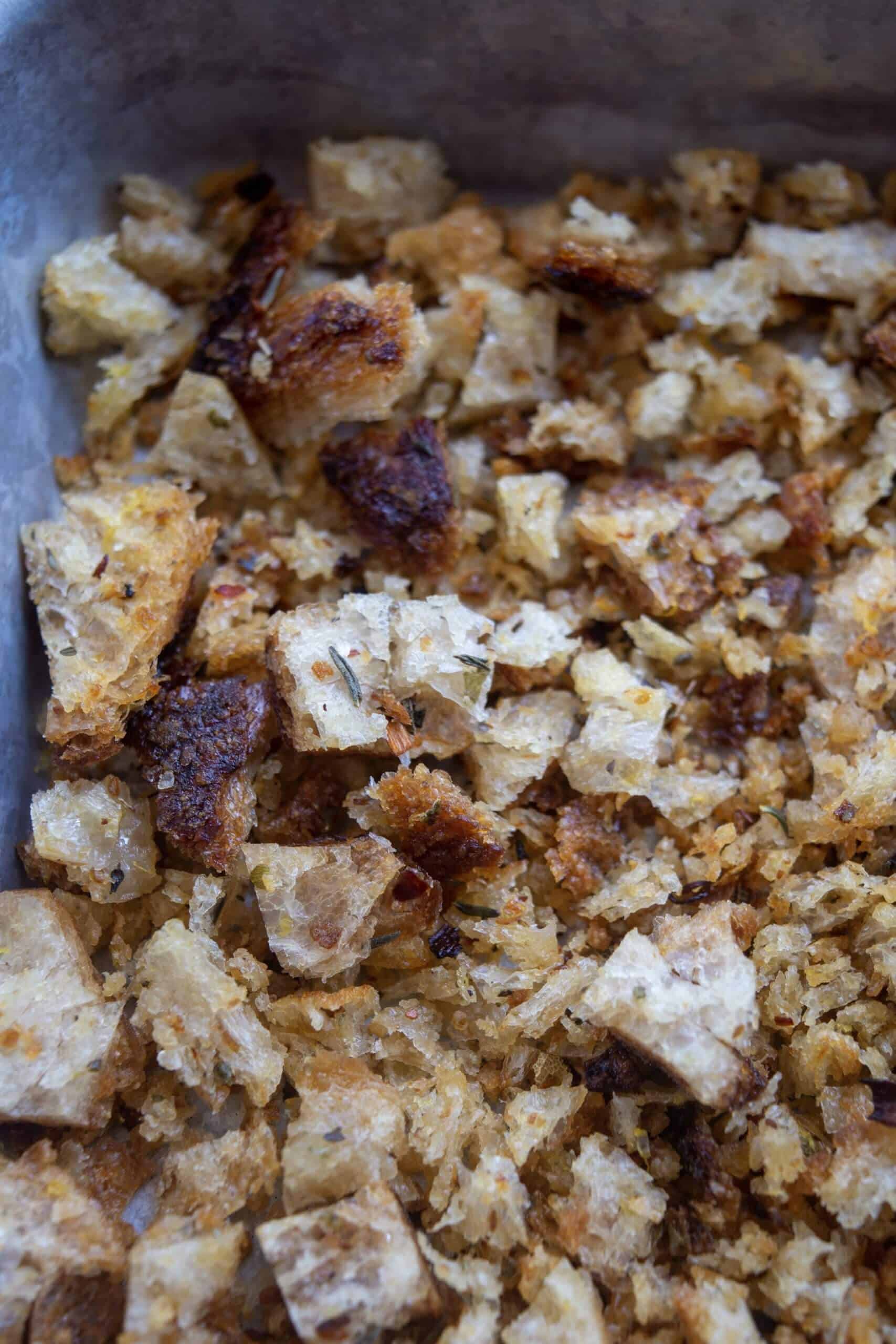 - You can now either turn the heat down to low and make your breadcrumbs in the pan or transfer to a sheet pan and bake in the oven @ 150c until golden and crispy - approx 10 minutes