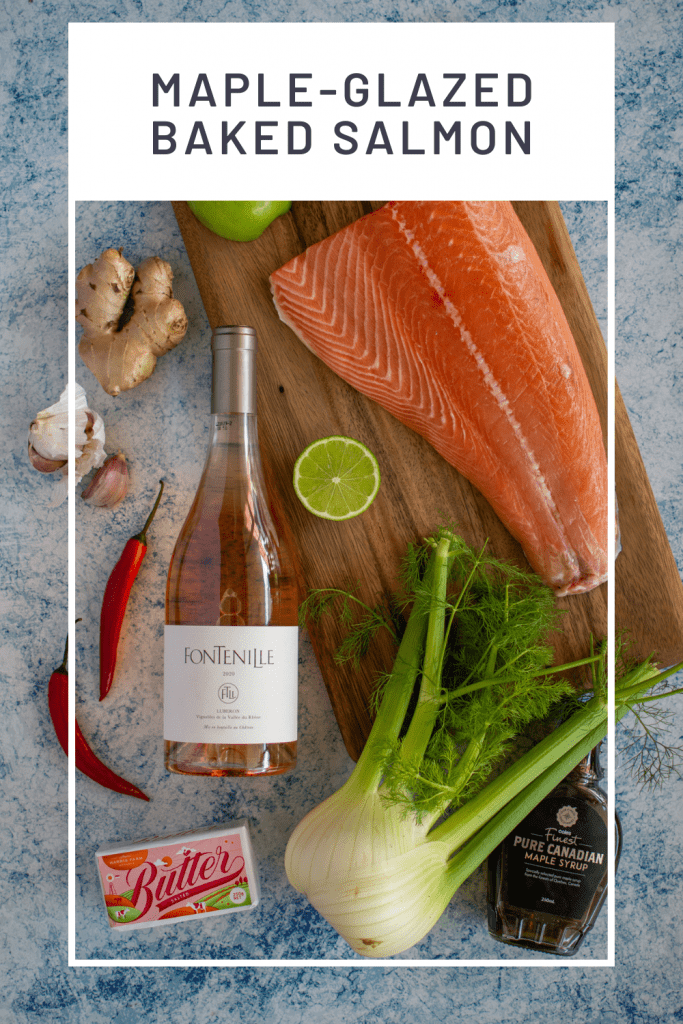 Start by placing the salmon skin side down on a lined baking tray. Glaze the salmon with your sexy brown butter glaze. Oh, sorry, I totally forgot - pour yourself a glass of Fontenille rose 😉 Then place the salmon into the oven at around 150-170c. The reason for the lower temp is that the salmon cooks slowly, which means less albumin is released.