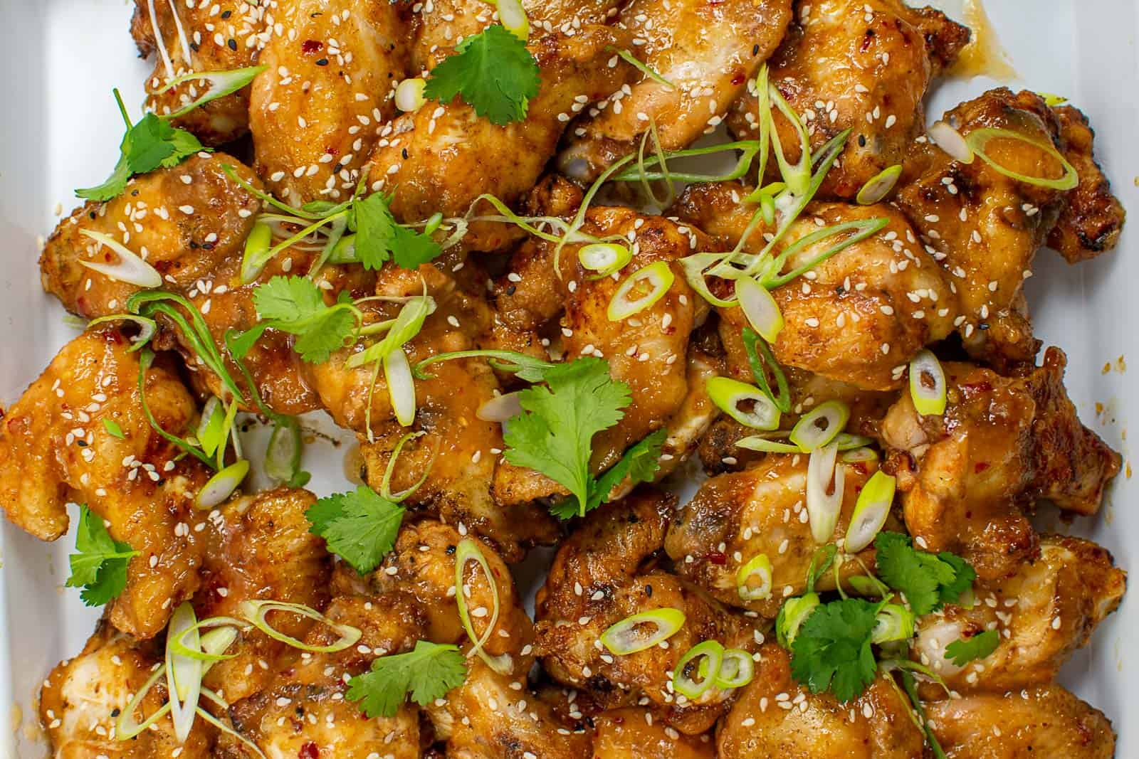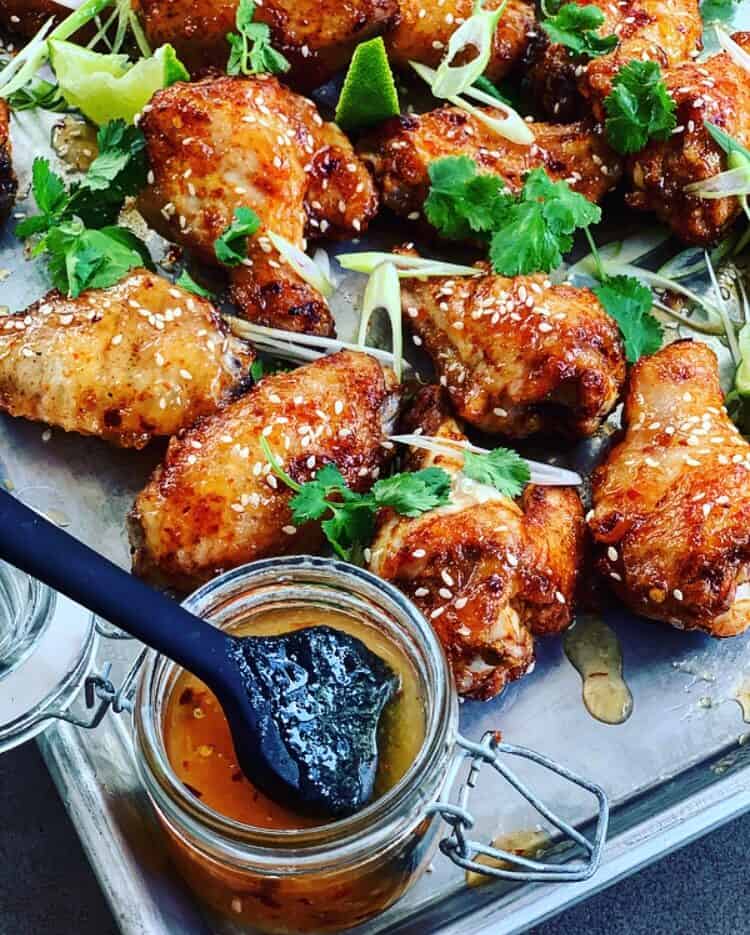 - Drizzle a little sauce over wings at the end and sprinkle sesame seeds, coriander & spring onions over the top. Serve with a few lime wedges
