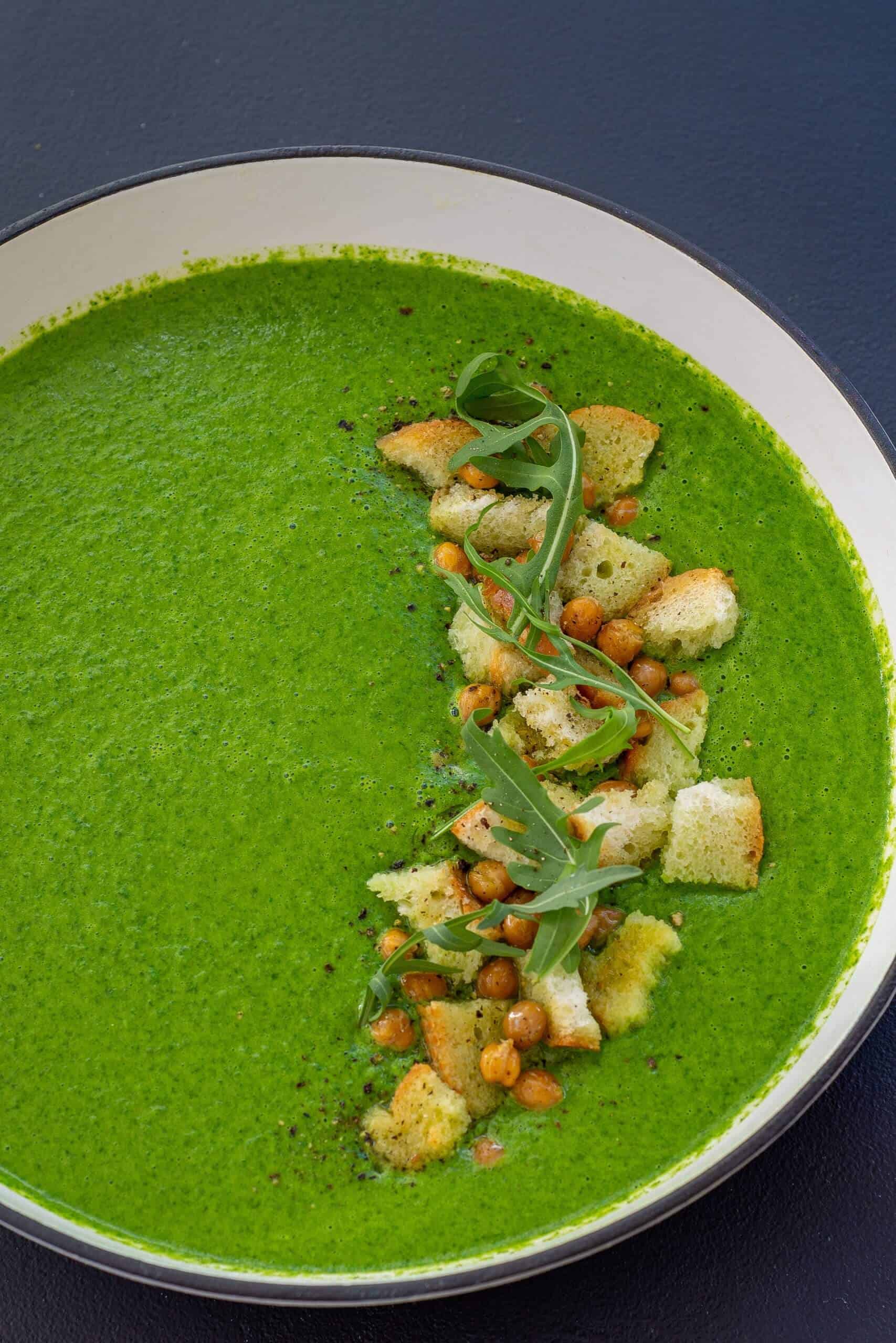 - Place soup in bowl and either in the centre or to the side place croutons & chickpeas. Place a couple leaves of rocket on top and finish with freshly ground black pepper