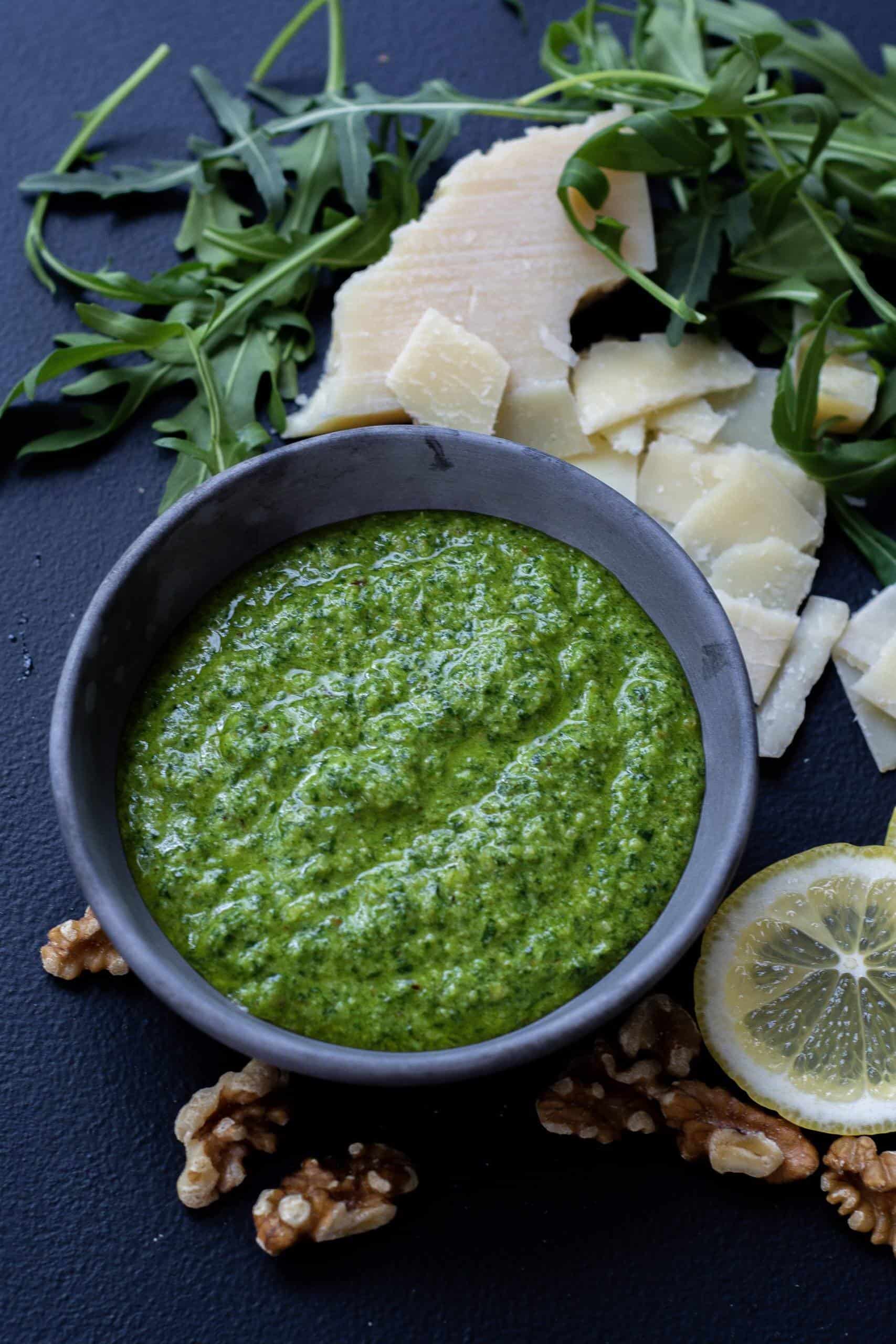 Pesto is so quick to make and utterly delicious. This simple rocket walnut pesto is exactly that! I had a catering gig the other day and had plenty rocket left over so figured it was time to re-create some recipes and snap some pics. The biggest issue being a food blogger (not a lover of calling myself that btw!) is remembering to snap pics when I make food or when you want to snap pics having the right lighting. Having all this extra rocket on hand helped me finish a few recipes I have been meaning to do.
