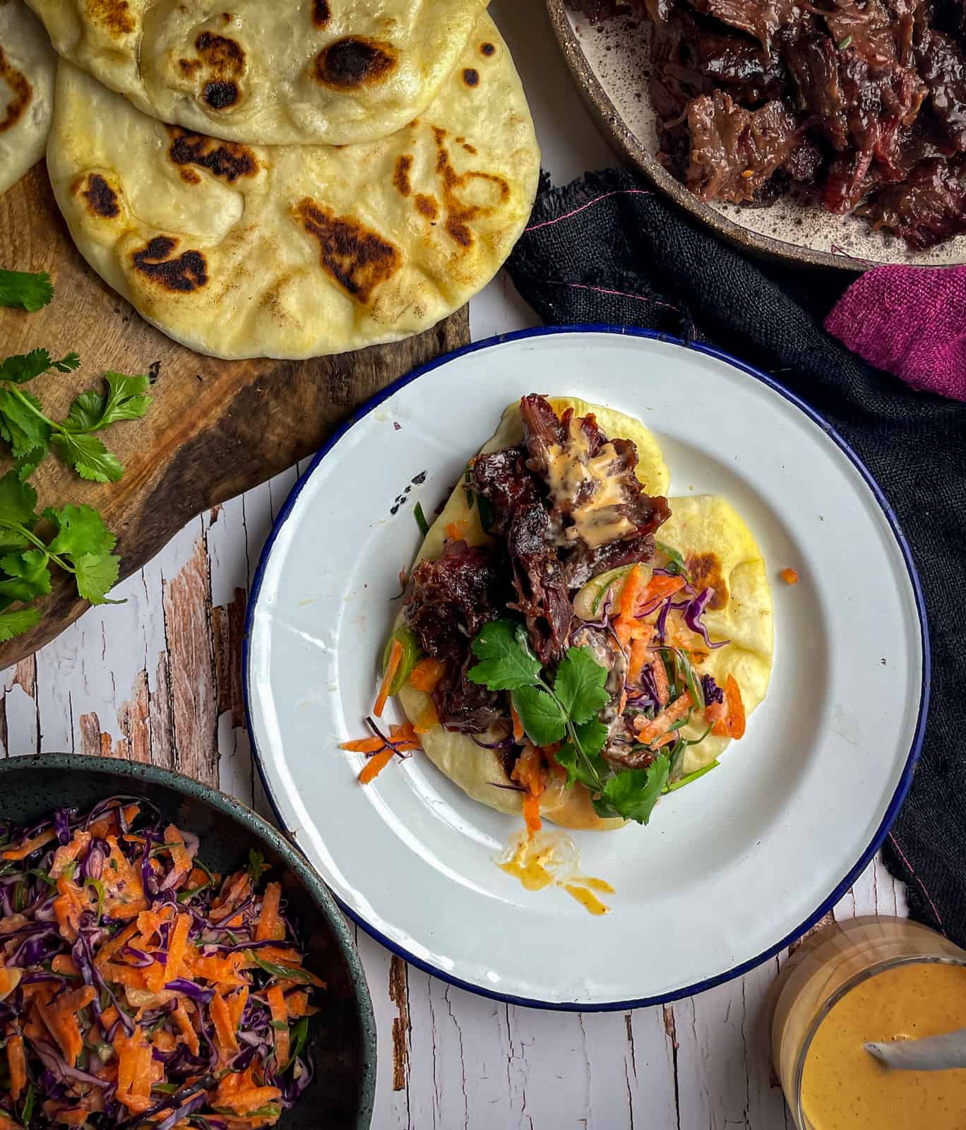 This is what brings the smoked beef cheeks pitas all together! Keeping it simple with this one I just mixed sriracha, mayonnaise/aioli and a little lime juice together. Alternatively, you can buy spiced mayonnaise in your local grocery store or if you want everything to be homemade check out my chipotle aioli recipe HERE!