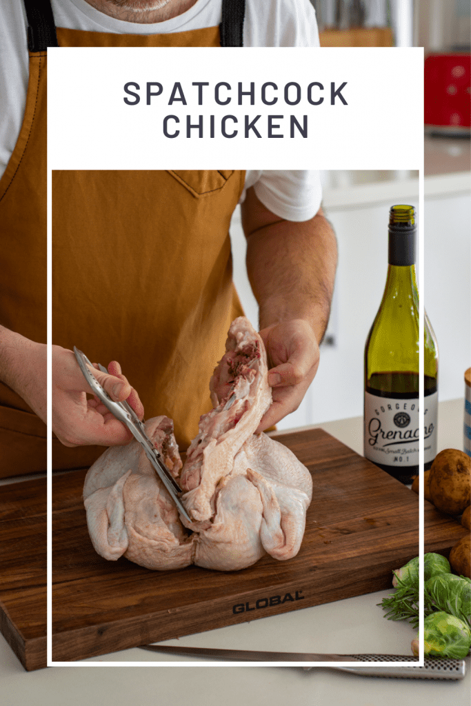 Using your kitchen shears cut down the back of the spine of the chicken. Which side is the spine you say? The opposite side to where the breast is! Once you have cut down one side cleanly then cut down the other side and you will have removed the spine. Next, lay it on the chopping board (breast side down). Where the breast bone starts there is a tiny piece of cartilage that if you slice it gently with a sharp knife you will separate the breast bone and your chicken will lie completely flat. Also known as scoring down the sternum to pop out that breast bone!