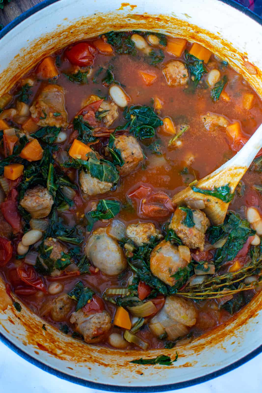 If ever there was a dish needed to warm you up, make you smile and be healthy too then this is it. It's got delicious Italian pork sausages, tons of vegetables from carrots, onions, celery to kale. Cannellini or white beans and some beautiful tinned cherry tomatoes and herbs.