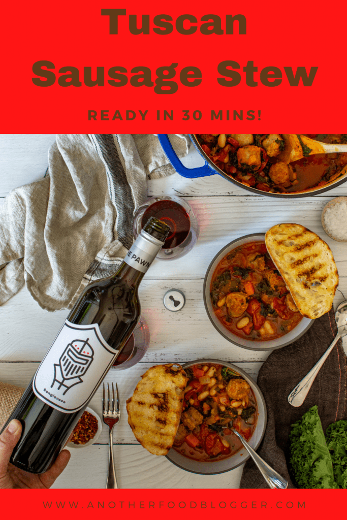 What's not to love. I've cracked a bottle of Sangiovese from The Pawn Wine Co and I need something to eat quickly before this delicious drop is gone. Well, what to pair with an Italian red? It's gotta be a Tuscan sausage stew. Loaded with vegetables, a kiss of spice from the chilli flakes, herbs, beans and some delicious Italian sausages. This sausage stew is healthy, full of flavour and will feed an army too. My recipe (below) is designed for 4ppl to share but double it up easily and the extended family is in for a treat 😉