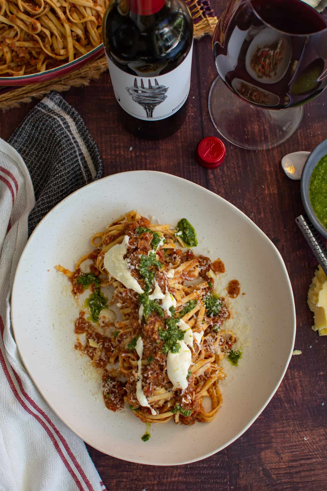 Bolognese is traditionally served with spaghetti, but to be honest, you can serve it with whatever pasta you prefer (don't say that to an Italian!). I've used fettuccine in this dish as I like the extra bite you get from the thickness.