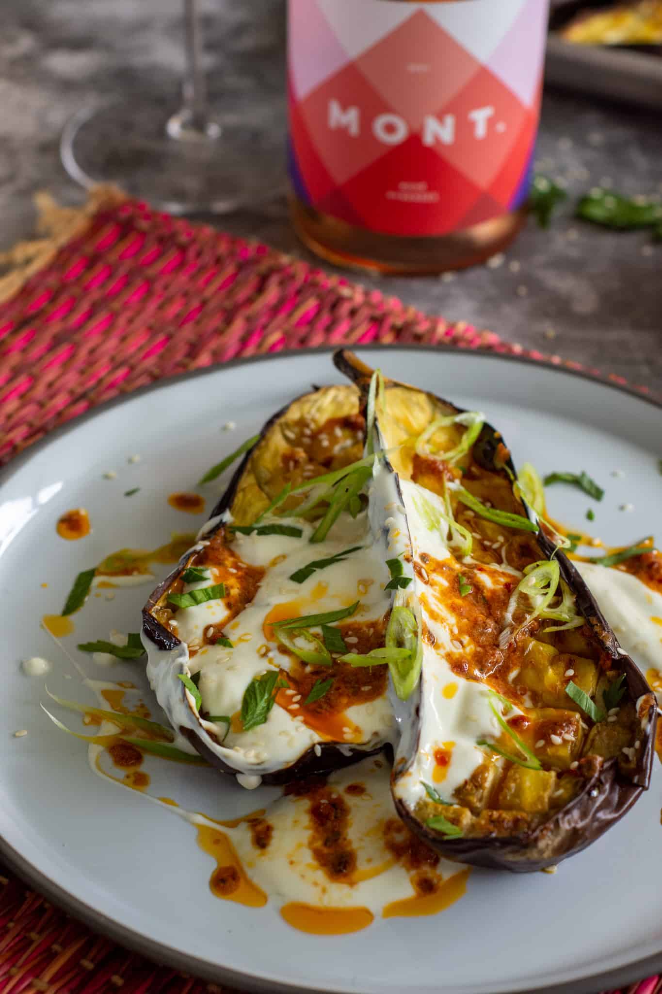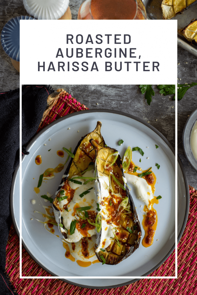 - Serve by drizzling yoghurt over aubergine and drizzle the harissa butter over the top. Finish with sliced spring onions, chopped parsley & sesame seeds