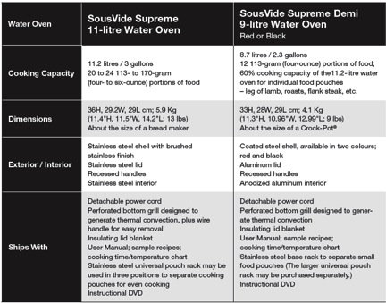 Both the SousVide Supreme and the Demi are extremely easy to use and feature countertop design. These high-tech home appliances cook food to perfection, producing tenderness and flavor unduplicated by other cooking methods. The above is a comparison chart illustrating the differences between the two products.