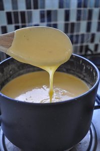 Gradually add the milk and whisk until it starts to thicken. Turn heat to low.
