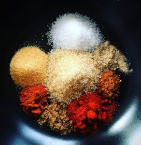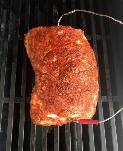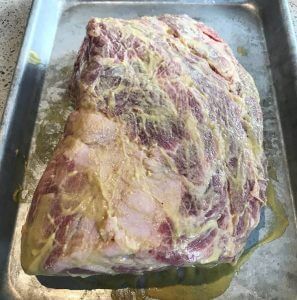 Rub the pork butt all over with the yellow mustard and rub on the dry rub ingredients.